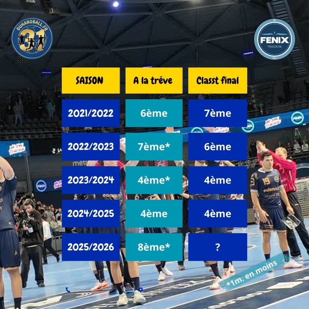 Pour le Fénix, la trêve est arrivée au bon moment. Et surtout, les hommes de Danijel Andjelkovic sortent comptablement de la phase aller sans trop de dégâts. Ils n’ont certes pas réalisé la performance des deux dernières saisons (voir tableau plus bas) mais avec un match en moins (celui de la 10ème journée qu’ils auront à disputer le 4 février 2026 à Cesson), ils ne sont qu’à un point du Top 5. Ils auront aussi à accueillir Chambéry et St Raphaël, leurs deux rivaux directs.
