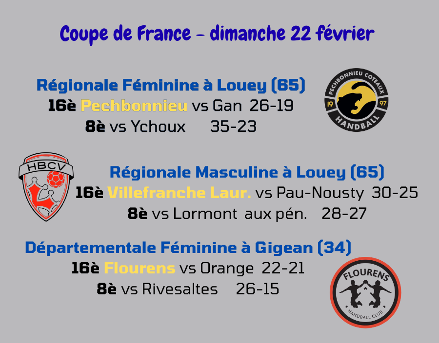 Pechbonnieu-Côteaux en Régionale Féminine, Villefranche de Lauragais en Régionale Masculine et Flourens en Départementale Féminine valident leur ticket pour les quarts qui se dérouleront le 1er week-end du mois d’avril.